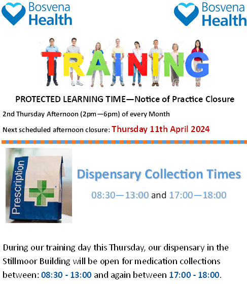 Protected Learning Time – Bosvena Health is closed in the afternoon on the 2nd Thursday of every month. The next scheduled closure is this Thursday, 11th April 2024.